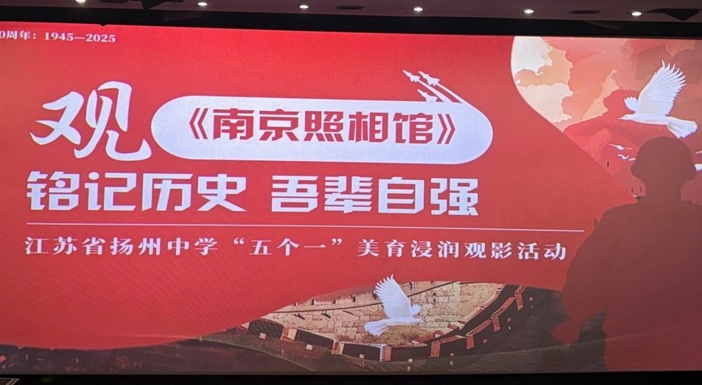 为深入开展“五个一”美育浸润观影活动,引导学生在光影艺术中感悟历史、涵养精神。9月27日下午,江苏省扬州中学组织高一部分班级学生,在班主任的带领下走进影院,集体观看历史题材影片《南京照相馆》,让学子在光影流转中触摸历史脉络,感悟时代精神。