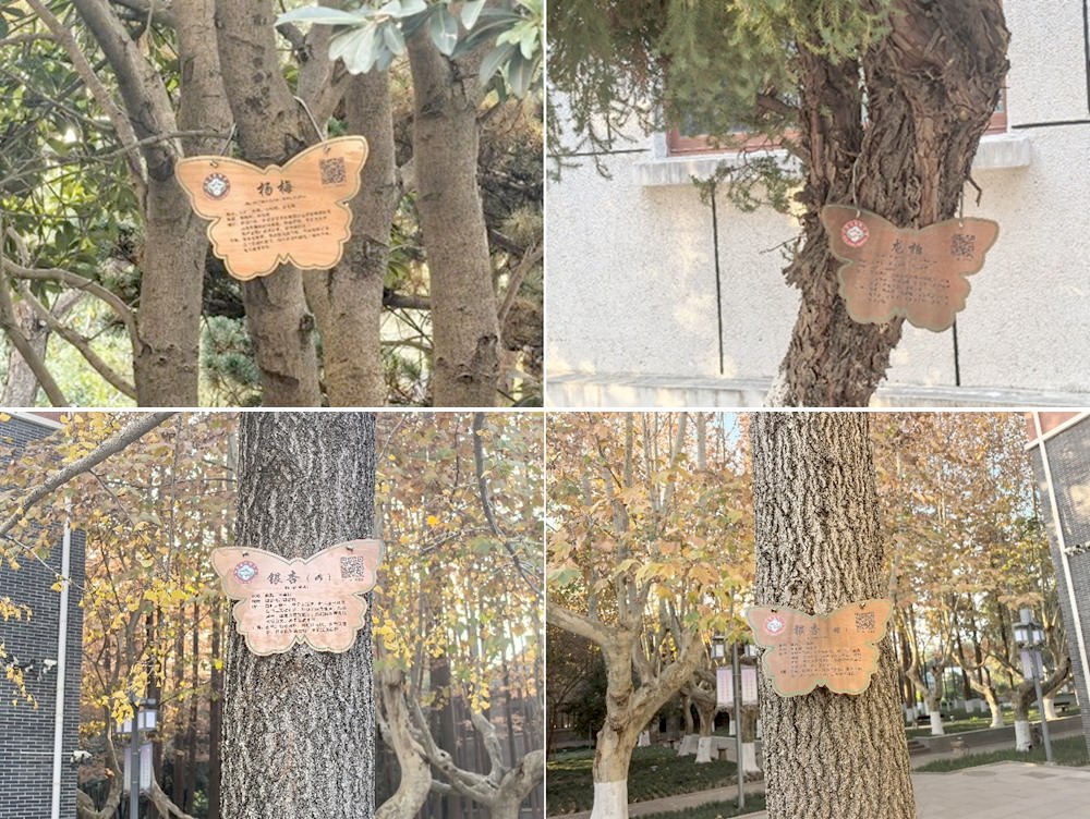 确定入选品种后,老师们聚焦挂牌的实用性与人文关怀,反复打磨设计方案。为不影响树木生长,特意选用弹簧绳,预留充足的生长空间;名牌上不仅印有扬州中学专属logo,彰显校园特色,更嵌入了科普二维码——扫码即可解锁植物的详细习性、生长周期、文化寓意等延伸知识,让小小挂牌成为“移动科普站”。地理组负责名牌的沟通与定制,全程兼顾美观度与实用性,每一处细节都彰显着“尊重自然、服务师生”的活动初心。