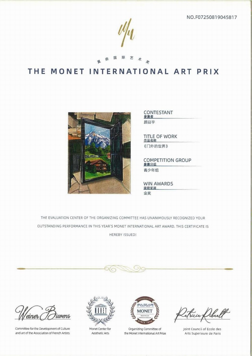 近日传来喜讯,我校高三国际班学生颜召宇在“莫奈国际艺术奖”中斩获金奖,展现出卓越的艺术才华与深厚的情感表达能力。