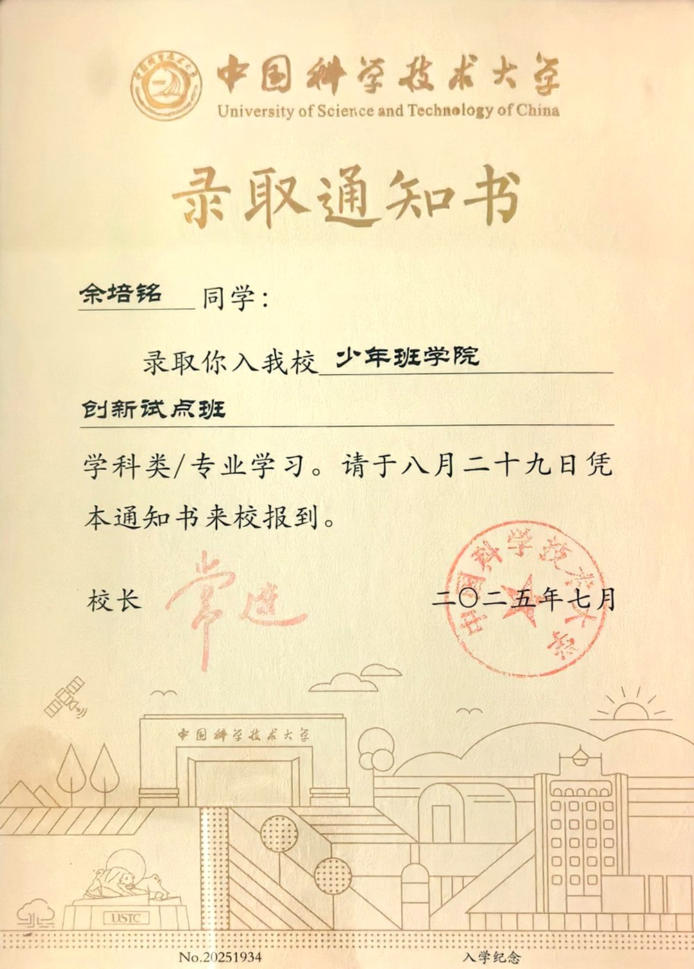 我校2023级高二学生余培铭凭借扎实的学科功底和出色的物理竞赛素养,成功考入中国科学技术大学少年班学院少年创新班(简称 “少创班”),提前开启了顶尖高校的求学之旅,成为众多学子羡慕的榜样。