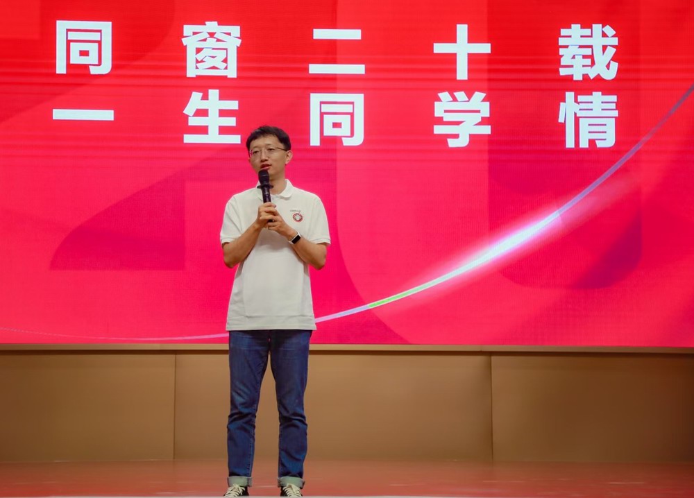 2005届校友代表茅少伟先生上台发言。他深情回顾了在扬中度过的美好时光,感恩老师们的谆谆教诲,并分享了二十年来的人生感悟。字字句句,饱含着对母校的深切眷恋和对同窗的真挚祝福,引发了全场强烈的共鸣。