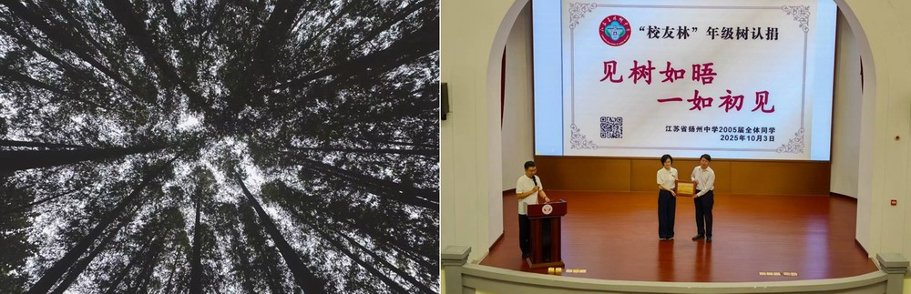 感恩与传承,是本次活动的核心。为感念母校培育之恩,2005届校友特意策划了极具意义的水杉林认捐仪式。校友滕蔓女士作为代表,向学校党委朱如忠副书记递交了在水杉林认捐树木的证书。水杉,作为扬州中学的标志与精神象征,挺拔向上,历久弥新。这棵水杉不仅将扎根于扬中的沃土,更象征着2005届校友对母校的感念之情生生不息,与母校共同成长。