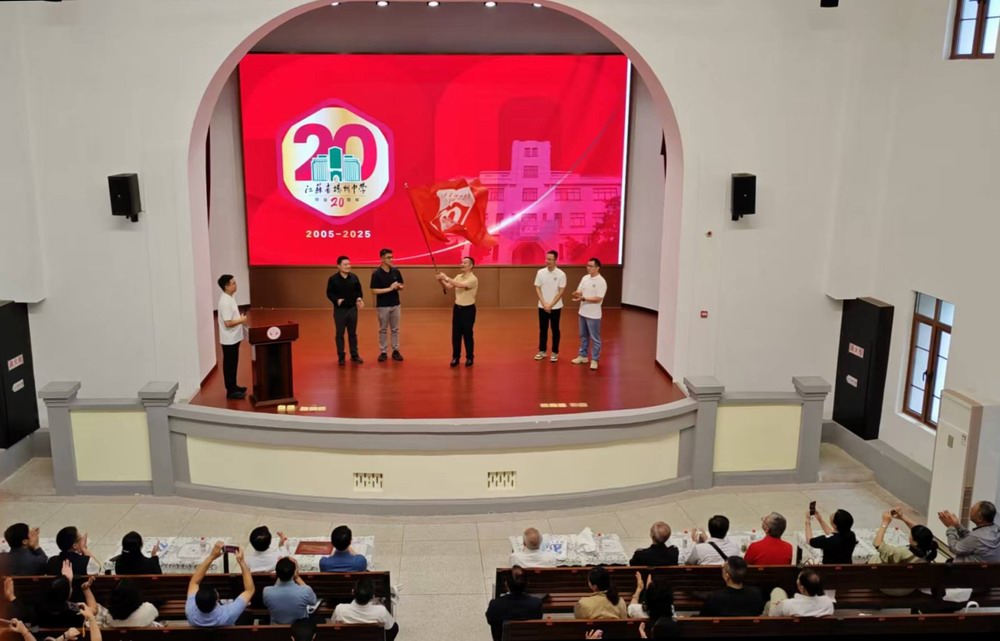 活动的最后,迎来了激动人心的旗帜传承环节。本次活动的核心策划与组织者05届校友王彬炬、许亮先生,代表2005届全体同学,将象征着情谊与传承的“二十周年毕业返校”旗帜,郑重交至丁爱军副校长手中,并由丁校长传递给2006届校友代表。这面旗帜的传递,不仅是责任的交接,更是扬中精神的绵延,它宣告着扬中人的青春故事年复一年,永不散场。
