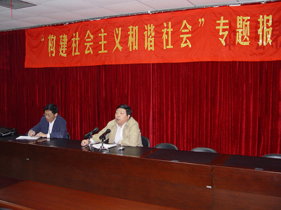 11月1日,我校举办学习十六届六中全会精神报告会,全体党员和入党积极分子参加了会议。报告会由学校党委书记张发祥同志主持,市委党校王淦教授作了《构建社会主义和谐社会是时代的必然要求》的专题讲座,为大家深入解读了十六届六中全会文件,全面剖析了构建社会主义和谐社会的必要性及基本要求。