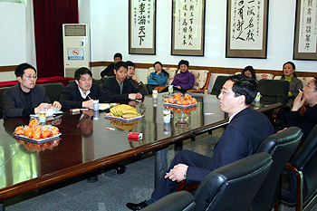 在海门中学,石校长介绍了学校的管理经验,重点介绍了高三复习的思路。学校的办学特色是在科学管理、人本师训、校本课题三个方面有突破,办学风格是现代化、高质量、示范性、有特色。在教师管理方面,努力形成一支以奉献、爱心为核心的师德高尚的教师队伍。树立“学生第一、工作第一、质量第一”的理念。实行夜办公、学生、家长、同行测评和月常规考核制度。教学观念上实现四个转变:由教学向学教转变;由教学向教思转变;由教学向教探转变;由教学向教育转变。学校目标是高考与竞赛齐飞,上线率与高分段并进,学生的现实与将来并重。具体指标是省大专上线率100%、本科上线率95%、本一上线率85%,全国排名前十二位高校的上线率60%,综合排名省前3名。在高三复习方面,课堂教学评估以“夯实基础、滚动提高”“因材施教、分层要求”的教学思想以及学生的“有效思维”和师生的双向互动为主要依据。讲好典型试题,讲好典型错误,提倡题串式讲评,挖洞式讲座。作业管理要求是四“精”四“必”,即精选、精练、精批、精讲,有发必练、有练必收、有收必批、有批必评。在二轮复习中,设法让学生形成成熟的学科思维体系和稳定的解题思维方法,使学生在新一轮复习的基础上获得考试思维主线,从心理上和思维上更加贴近高考。具体做法是,变介绍方法为选择方法,突出解法的发现和运用;变全面覆盖为重点讲练,突出高考热点问题;变追求数量为追求质量,突出讲练结合。董校长对海门中学高三精细化、体系化的复习思路表示了浓厚的兴趣。他说,扬州中学在百年的办学历史中形成了较为先进的教学思想和完备的教学思路,扬中人代代传承与弘扬,使学校不断走向辉煌,但在新的历史背景下,新一代扬中人不能简单沿袭传统,应在继承的同时,多学习兄弟学校的成功的经验,赋予扬中的传统更多的时代内涵。