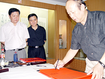 学校党委书记、副校长张发祥同志带领来宾参观了在树人堂的校史陈列室,通过介绍校史使他们了解我校百年办学的理念和特色。考察团一行对我校培养出一大批杰出人才、已经走出42位院士表示赞赏,对我校充满古代气息与现代文化的校园风貌赞不绝口。徐州市教育局强国局长在参观结束时欣然命笔留念,并祝愿我校在江泽民同志两次题词精神的指引下,再创新的辉煌。