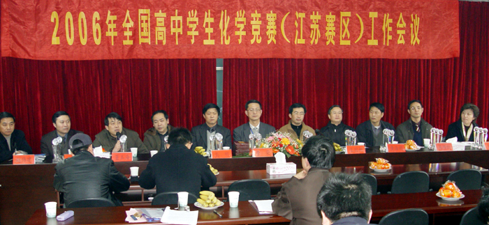 会议由江苏省化学化工学会秘书长赵伟建主持,我校董玉海校长致欢迎辞,扬州市教育局局长助理王玉军到会表示祝贺并发表讲话,南京工业大学党委记高明、省青少年科技中心主任黄海鸥以及省高中学生化学竞赛奥委会主任王志林和马宏佳等发表了讲话。会议传达了中国化学会2005年工作会议有关精神,颁发了“南化•福达杯”2005年全国高中学生化学竞赛(江苏赛区)优秀成绩奖、优秀组织奖。会议还布置了“南京工业大学杯”2006年全国高中学生化学竞赛(江苏赛区)竞赛的相关工作,讨论了我省承办2008年全国高中学生化学竞赛暨冬令营的有关事项,各市、学校进行了工作经验交流。