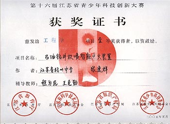 该发明已经获得2005年扬州市青少年科技创新大赛高中组一等奖,江苏省青少年科技创新大赛高中组一等奖,第十七届江苏省亿利达青少年发明奖竞赛一等奖。经科技查新,目前国内外尚无此产品,是一项实用新型发明。该装置可应用于石油、化工、油站、气站及相关民用设施的安全应急系统。